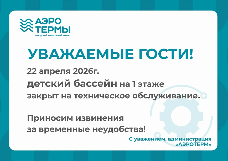 «АЭРОТЕРМЫ» – это уникальное пространство для всех возрастов, где царит тепло, радость и комфорт в любое время года. Термальный курорт, расположенный в центре города рядом с ТРЦ «АЭРО ПАРК», является отличной альтернативой традиционным курортам, позволяя проводить целый день с пользой для здоровья и отдыха без выезда из города. Здесь каждый найдет что-то для себя: разнообразные бани и сауны, бассейны как в закрытых, так и открытых зонах, купели с разными температурами, а также кафе и зоны для семейного отдыха, СПА процедур.